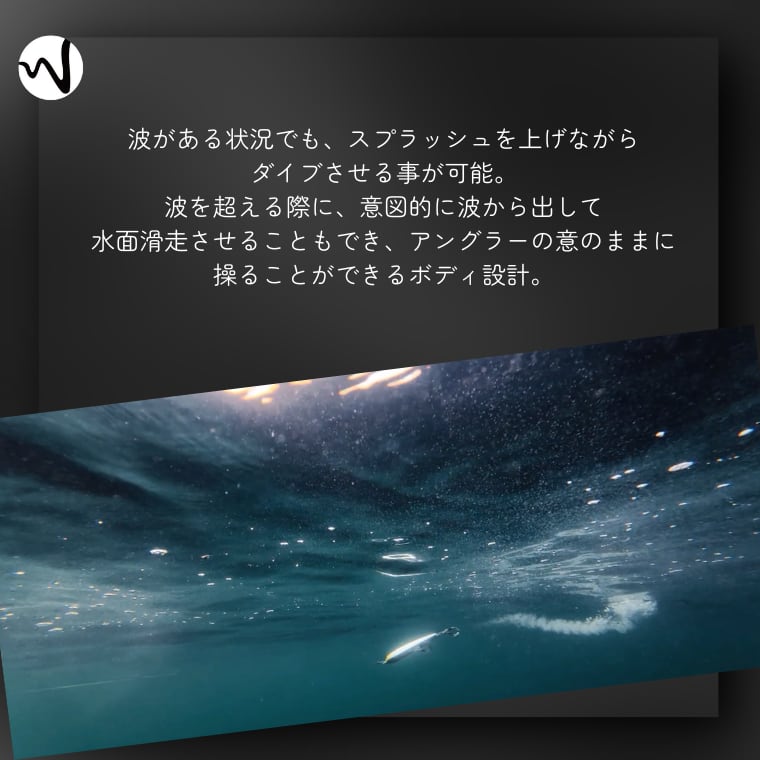 波がある状況でも、スプラッシュを上げながらダイブさせる事が可能。波を超える際に、意図的に波から出して水面滑走させることもでき、アングラーの意のままに操ることができるボディ設計。