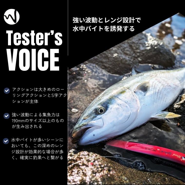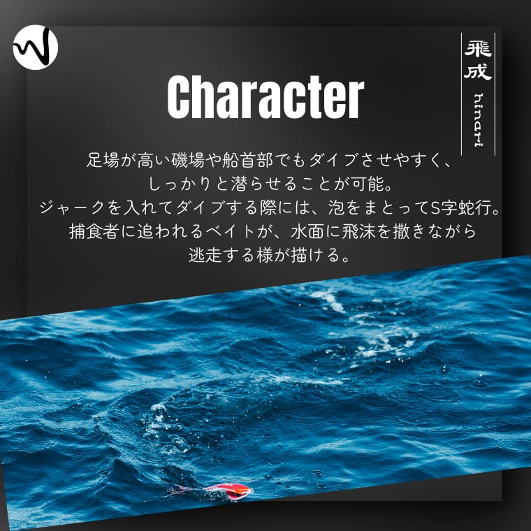 ダイブ時に強いジャークを与えると、強波動を伴うS字アクションが可能。ラインテンションを抜くと、逃げ場を失ったベイトが水面に浮かび上がる様子が再現可能です。